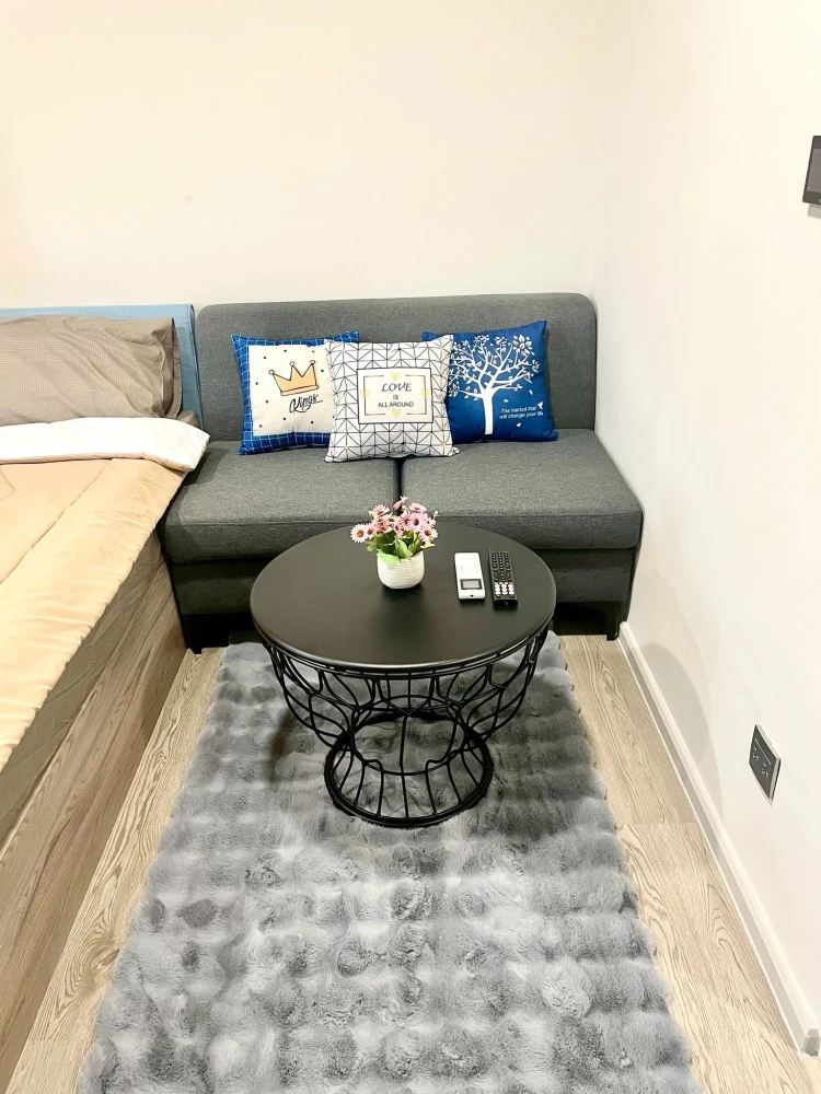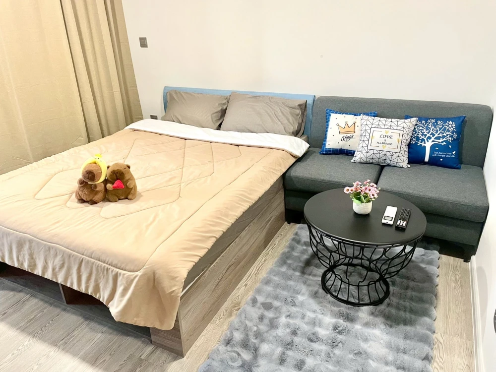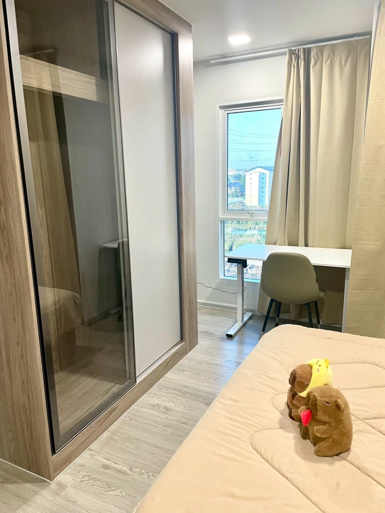 • เฟอร์นิเจอร์ครบ: เตียง 5 ฟุต, ตู้เสื้อผ้า, โซฟา, ชั้นวางทีวี, ม่าน